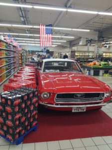 Surprise ce matin, une magnifique FORD MUSTANG de couleur rouge est exposée dans l’entrée d’ INTERMARCHE. Renseignements pris il s’agit de la FORD MUSTANG de 1967 de Stéphane. Elle restera en place durant quinze jours car le magasin fait une campagne de vente de produits US sur cette période