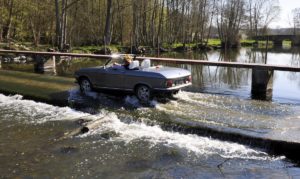 Puis il a fallu reprendre la route pour un arrêt casse croûte très apprécié à la sortie de VARIZE…l’heure avance il faut se remettre au volant pour rejoindre à la sortie de la TOUCHE et passer le LOIR sur le gué…on en profite pour prendre de très belles photos des véhicules traversant ce gué (nous n’avions pas pu le faire lors de la reconnaissance en raison d’un débit du LOIR plus important)