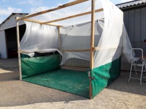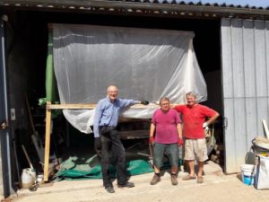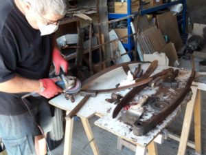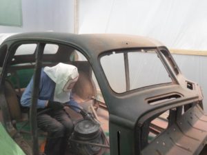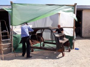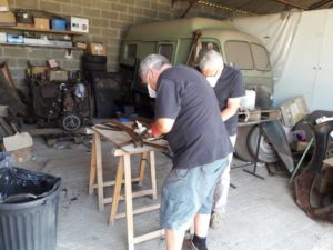 Ce lundi 9 juillet, Gilles D., Thierry, Patrice, Dominique, Serge, Denis, Gilles H., Raymond se sont retrouvés à BACCON pour une dernière journée de travail sur la 402 avant de prendre un peu de repos. Une bonne partie de la matinée a été consacrée à la construction d’une cabine de sablage rudimentaire, Thierry et Serge ont démonté et nettoyé les lames de ressort de la suspension du train avant, Patrice a remis son casque d’extra terrestre pour continuer le sablage de la carrosserie qui s’annonce long et délicat…Tout va bien , tout le monde a été bien occupé sur cette journée.Jacques BOURGOUIN, délégué local de la Fondation du Patrimoine nous a rendu visite, il a salué notre travail et donner quelques conseils pour compléter des dossiers afin de déposer des demandes de financement auprès de la Fondation. Notre « garagiste » Michel est venu aussi pour soutenir l’équipe.A noter que Denis a créé un outil EXEL qui nous permettra un meilleur suivi de notre projet avec un calendrier d’objectifs à atteindre.A noter que chez Michel MARINAULT nous avons trouvé quatre roulements pour les bras de transmission sur l’essieu arrière dans leurs emballage d’origine, ainsi qu’un disque d’embrayage!!