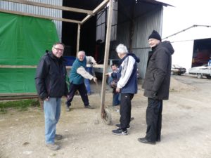 Tout cela dans une ambiance conviviale….Il est 12H30 il faut déjeuner mais avant c’est « apéro » (Rosé pamplemouse, Jurançon offert par Georges, jus d’orange…) Au menu: pâté, tarte à l’oignon, rôti de porc à la moutarde de Dijon, chou rouge à la polonaise, fromages et gâteaux confectionnés par les épouses qui « pensent à nous »…café…et reprise du travail! Personne à la sieste!