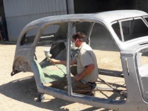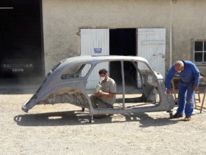 Notre équipe a poncé la carrosserie de la 402 et plusieurs pièces…Gilles s’est appliqué à passer un phosphatant mais notre journée a été écourtée par les averses…On reviendra lundi 15…