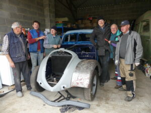Notre équipe remonte à blanc toutes les pièces de carrosserie sur la caisse définitivement fixée sur le châssis pour les différents ajustements…la présence de Vivien DESCHAMPS spécialiste de ce type de voiture est un grand plus pour faire avancer nos travaux.