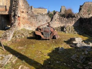 Dans ces ruines où le temps s’est arrêté: quelques « squelettes » de voitures: une Traction, une C4…et la 202 du Dr MULLER restée telle quelle sur la place du village où les SS avaient rassemblé toute la population du village, 600 personnes en ce terrible jour du 10 juin 1944.
