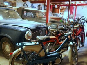 Avant de quitter ce lieu bucolique nous sommes invités par Denis qui nous invite à venir visiter son hangar où dorment plusieurs anciennes: des Simca, une 2CV, une 4CV, une Licorne ainsi que de nombreux Solex, mobylettes..l’horloge tourne nous promettons à Denis de revenir le rencontrer pour une visite plus longue…nous sommes attendus à la cave GUEROT pour une dégustation de vin des Coteaux du Giennois et fromage de chèvre…