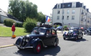 Invité par la Municipalité à participer à la journée commémorative pour célébrer les 80 ans du Débarquement et de la Libération notre club a fait l’unanimité ….un défilé de quatorze véhicules datant de cette époque a connu un très gros succès: une RENAULT NN, deux CITROEN C4, deux PEUGEOT 402, une PEUGEOT 202, une PEUGEOT 201, trois CITROEN TRACTION, une AMILCAR, deux JEEP, un triporteur tous pavoisés aux couleurs de la France et des alliés a été accueilli sous les applaudissements…un nombreux public et de nombreux élus ont apprécié notre présence…Après un sympathique et convivial pique nique tiré du coffre réunissant une trentaine de personnes nous avons participé à un défilé dans les rues de la communes portant des noms évoquant cette époque…