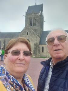 En arrière plan, l’église de Ste Mère l’Eglise avec le parachute toujours accroché et un moyen de locomotion que notre groupe empruntera