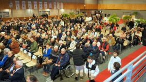 1400 personnes invitées, une cérémonie originale où tout se fait en chansons !Le Conseil Municipal, le Conseil des Jeunes sous la direction d’Aurore CARO une maire tonique, épatante dirige tout ce monde sur la scène…Son discours est entrecoupé par des chansons, des paroles adaptées sur des mélodies de JJ Goldmann, Aznavour…